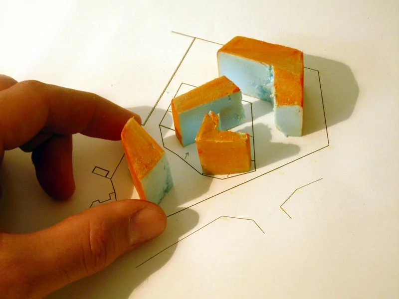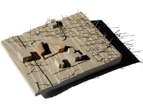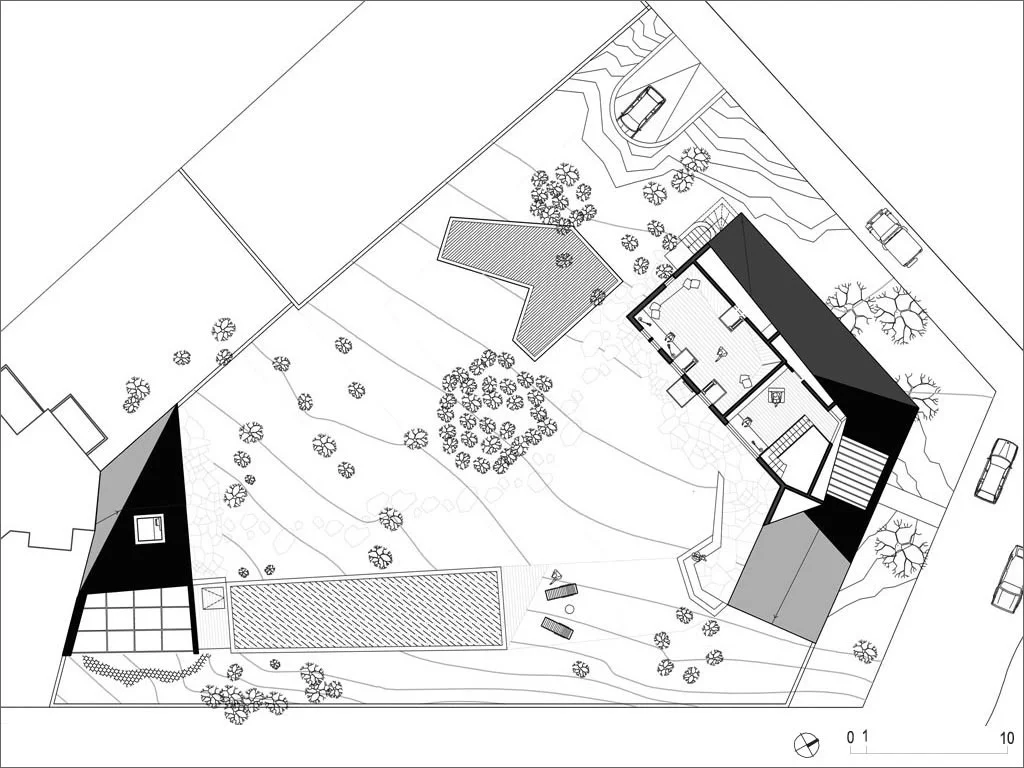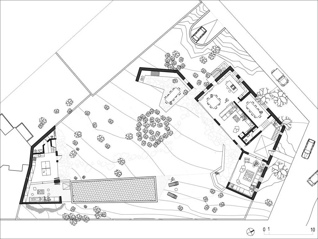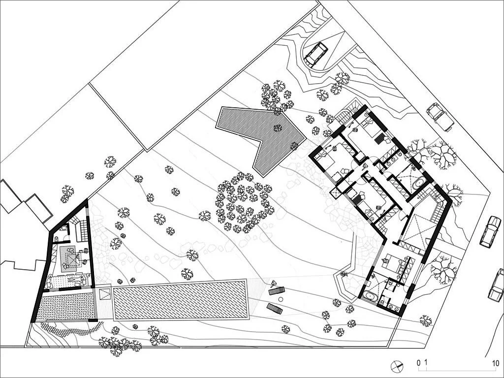 Upon visiting the plot in Dionysos, there was an immediate desire to inhabit its edges as if pushed by a centrifugal force, due to its bowl-like topography, higher on the sides, lower in the center and the fact that the heart of the plot was very lush and heavily forested. Also, the peculiar planning restrictions of Dionisos, where the buildings are allowed to touch the borders of the plot, instead of the usual detached suburban system, were in line with this.