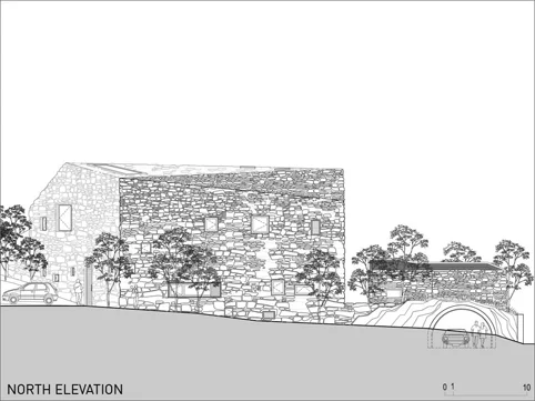 The strong urge for edge inhabitation inspired the concept of the Pangaea. Much like the single supercontinent that existed about 250 million years ago, before the component continents were separated and moved into their current configuration, the house, a family residence, is designed as a single, irregular, multi-faceted stone volume, which eventually fractures and separates into four pieces: the main house, the garden shed/play house, the barbeque and the pool. The stone exterior is constructed in strata of different stones where larger pieces create the base for smaller ones. Each distinct volume settles at the edges of the plot, revealing at the locations where fractured, softer wooden, more open inner facades and defining at the same time, a large, central, open green space with most of the existing trees intact, thus preserving the feeling of living in a forest.