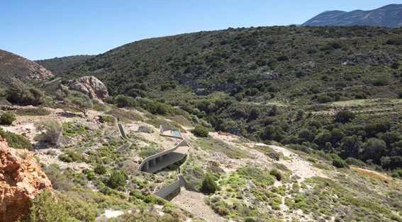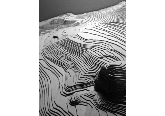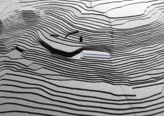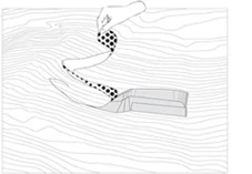 The Peel’ is a house that adopts the morphology of the site. It creates a folded plane of planted earth to conceal the building mass while simultaneously opening its facade to reveal the views and create exterior spaces. From above, the roof is punctured to create atriums and skylights that bring in light and air through carefully sculpted spaces. The flows within the house lead to moments tied to the landscape such as the stair that leads to the ‘diamond stone’, an impressive geological landmark. The outcome is a flowing intervention that provides a diversity of experiences while respecting and enhancing the natural qualities of the place.