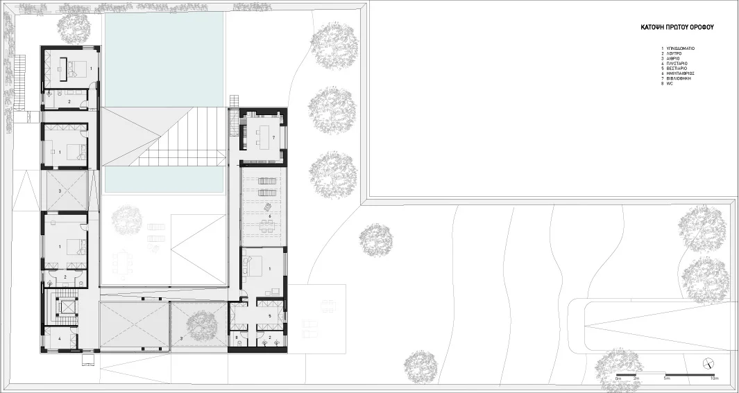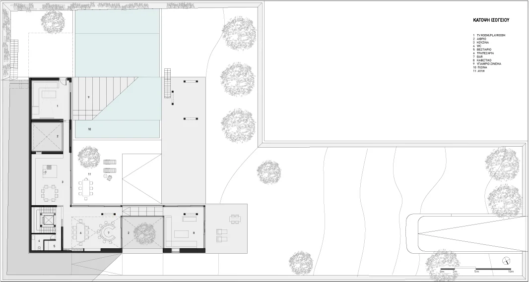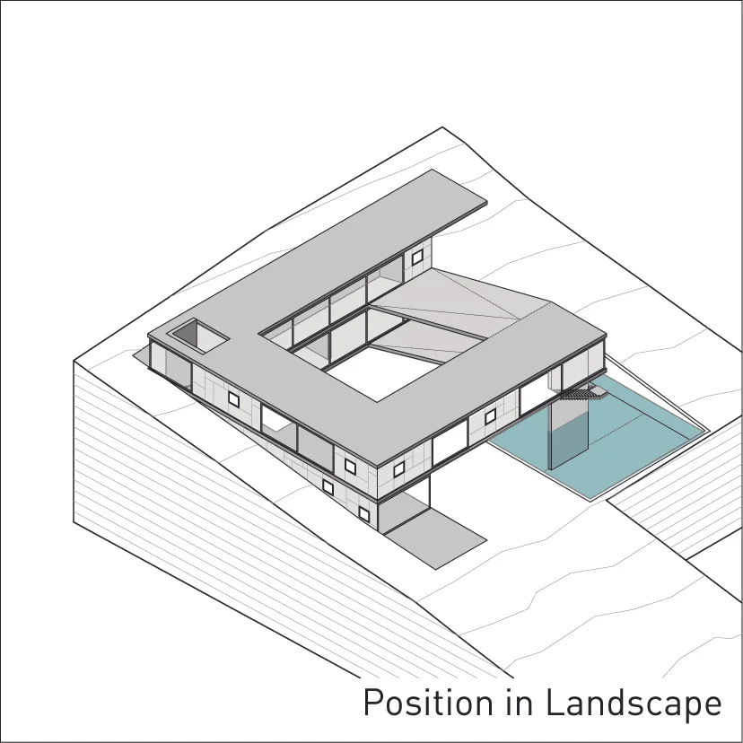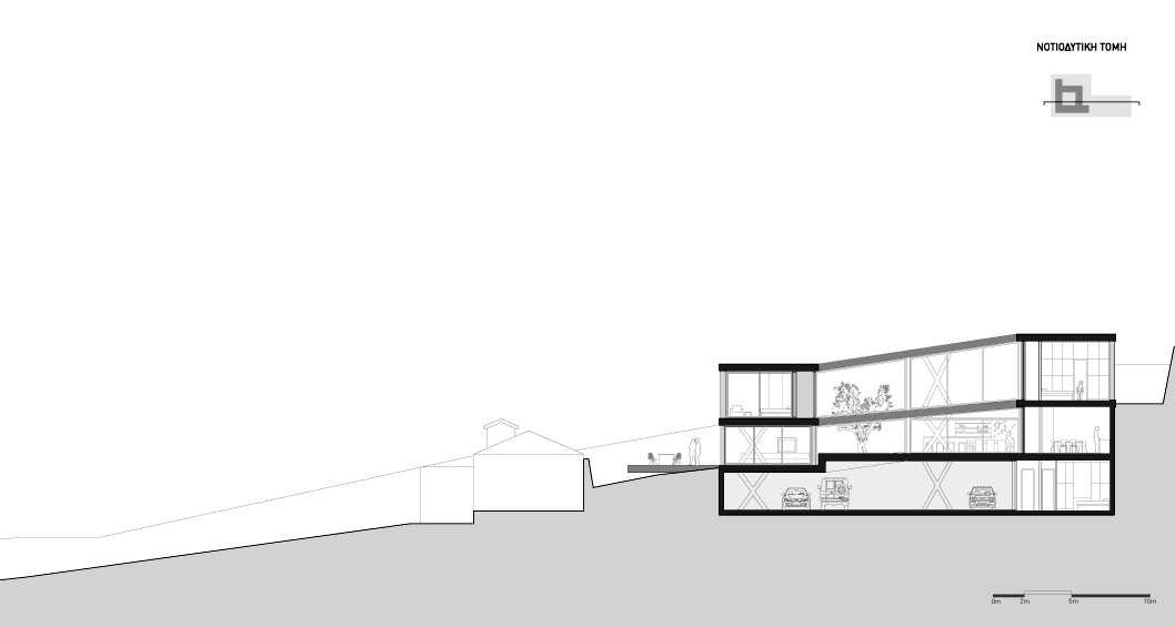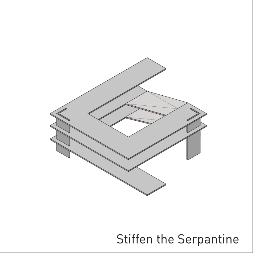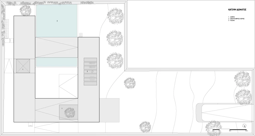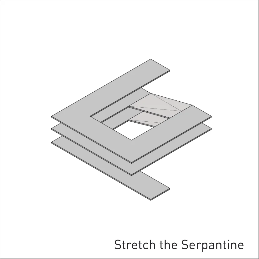 The serpentine is a family residence located in the suburban settlement of Saronida. The house is introverted, arranged around a square courtyard (12x12 meters) and turning its back on the streets and houses that surround it. A continuous 6 meter wide, 140 meter long slab wraps around the courtyard three times. The unraveling slab forms the ceilings and the floors for all the interior spaces. A metal scissor structure separates the layers of the slab, while wooden and glass panels provide enclosure. The public areas of the house are located on the ground level. The interior spaces are uninterrupted by walls and have an immediate connection to the courtyard through operable glass panels. The communal spaces flow upwards through a covered exterior ramp that acquires the function of an exterior cinema. At the end of the ramp, on the first floor, there is a continuous corridor that overlooks into the courtyard from which all the private rooms are accessed. The serpentine house plays with the typology of the courtyard house, using the spatial mechanism of the unraveling plane as a vehicle to create spatial interrelations between movement views and use.
