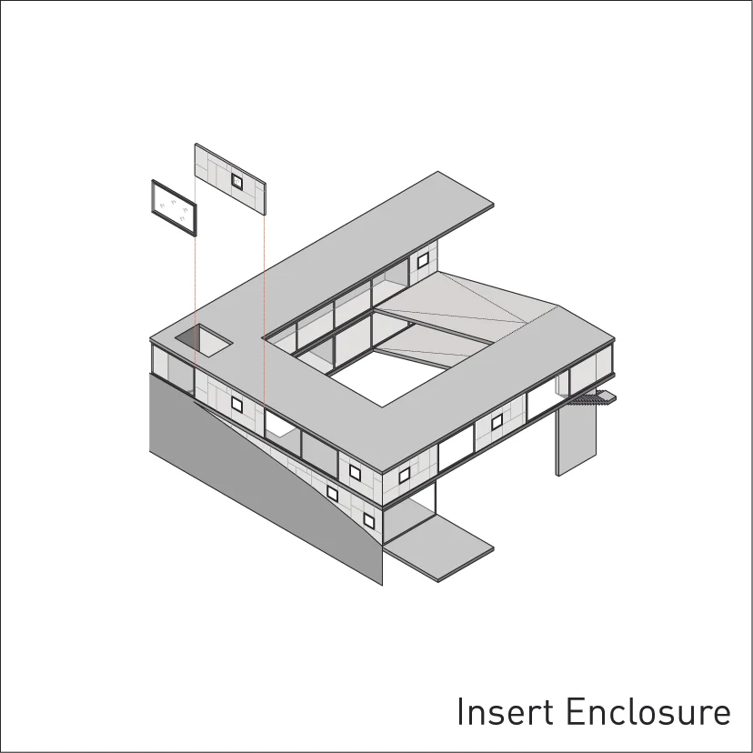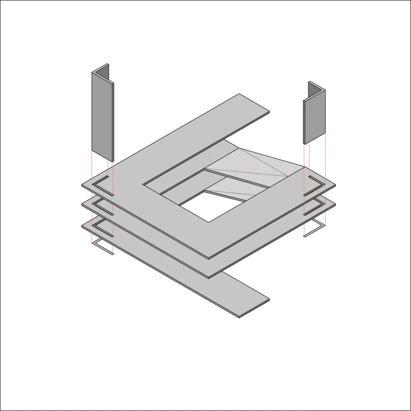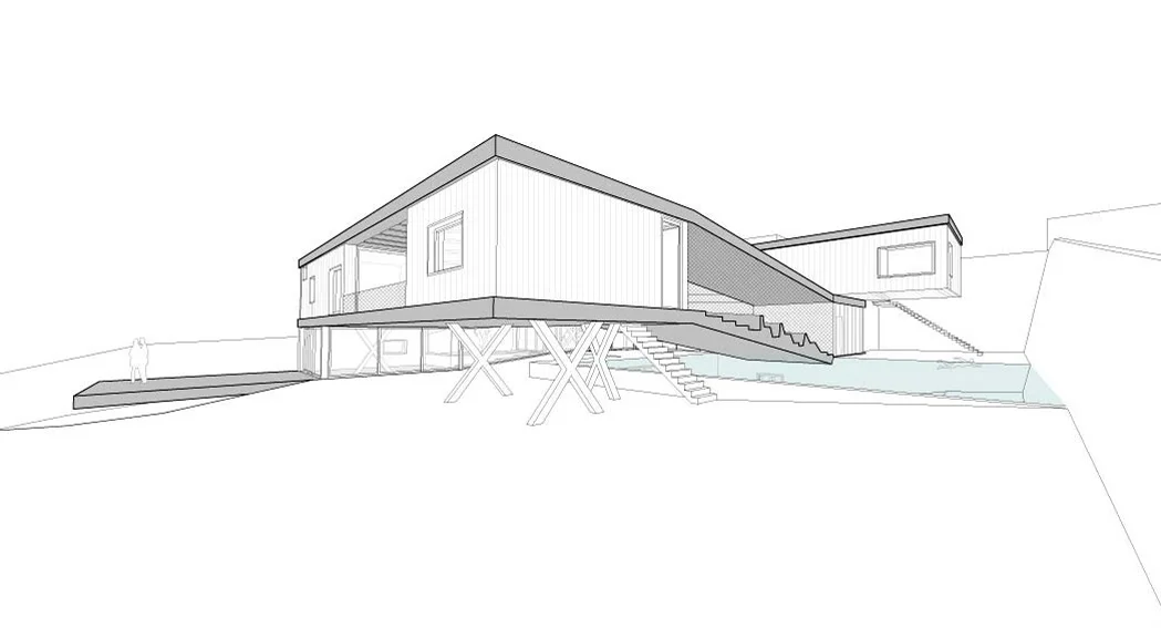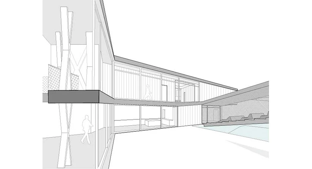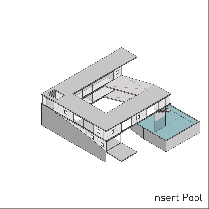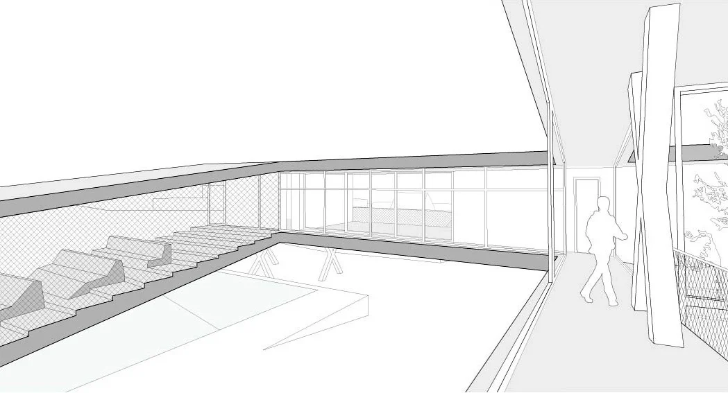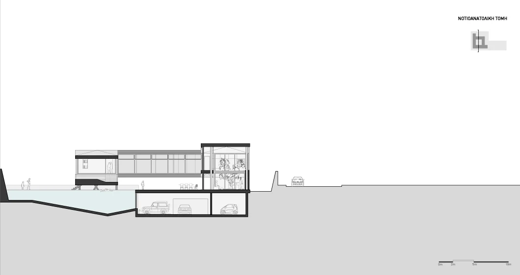 The serpentine is a family residence located in the suburban settlement of Saronida. The house is introverted, arranged around a square courtyard (12x12 meters) and turning its back on the streets and houses that surround it. A continuous 6 meter wide, 140 meter long slab wraps around the courtyard three times. The unraveling slab forms the ceilings and the floors for all the interior spaces. A metal scissor structure separates the layers of the slab, while wooden and glass panels provide enclosure. The public areas of the house are located on the ground level. The interior spaces are uninterrupted by walls and have an immediate connection to the courtyard through operable glass panels. The communal spaces flow upwards through a covered exterior ramp that acquires the function of an exterior cinema. At the end of the ramp, on the first floor, there is a continuous corridor that overlooks into the courtyard from which all the private rooms are accessed. The serpentine house plays with the typology of the courtyard house, using the spatial mechanism of the unraveling plane as a vehicle to create spatial interrelations between movement views and use.