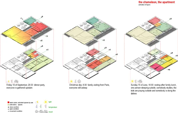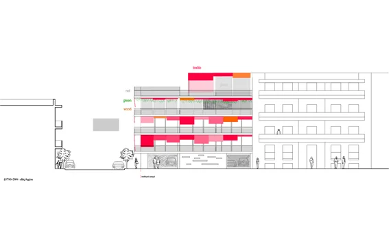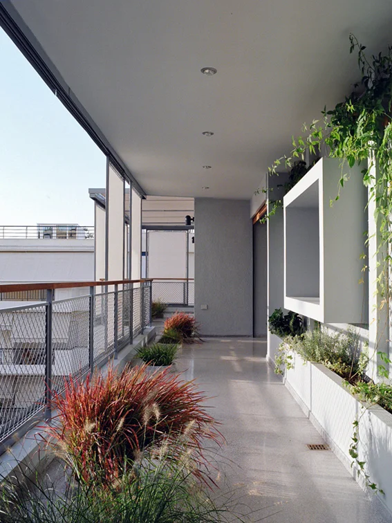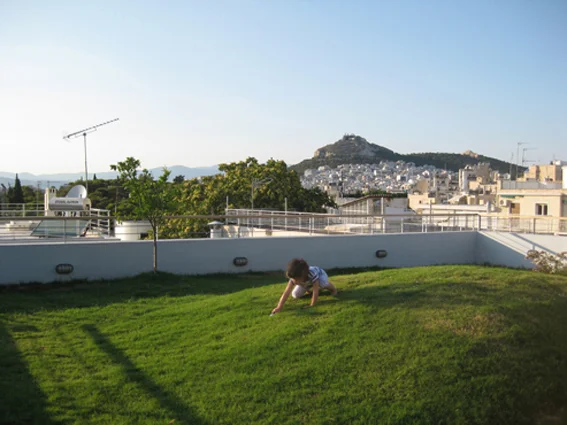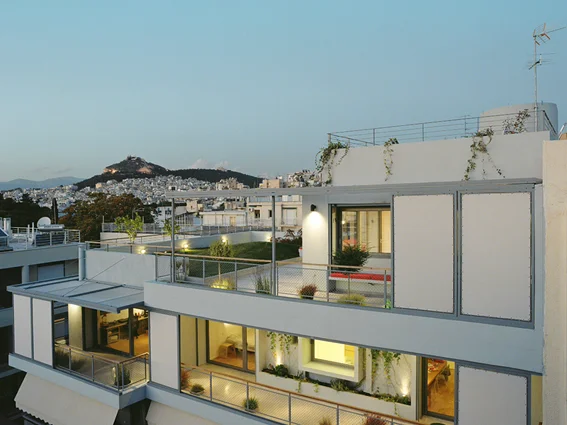 The opportunity was seized to express these contrasting economies very clearly. Moving away from the usual residual approach to outdoor spaces (balconies) with the odd mop and broom parked on the side, here the terraces extending on three levels, are treated as prime spaces and furnished with multiple layers of use: built in terrazzo planters and clothes lines, stable and retractable pergolas, net railings, a barbeque area with ample seating, vertical sliding panels, providing shading and privacy, constantly transforming the facade and a vast green roof for farming, playing and resting, while enjoying the view of the Lycabettus hill.