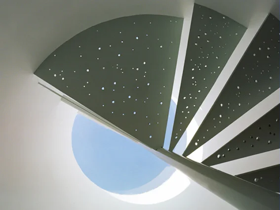 The interior spaces occupy two floors and communicate through a custom designed steel circular stair, progressively pierced as it moves up, its concrete shell and treads washed with light through a glass ceiling. All spaces, public and private, are designed with built in furniture, both a unique characteristic of the apartment and a clever way to provide free space with a maximum amount of practical storage and shelving.
