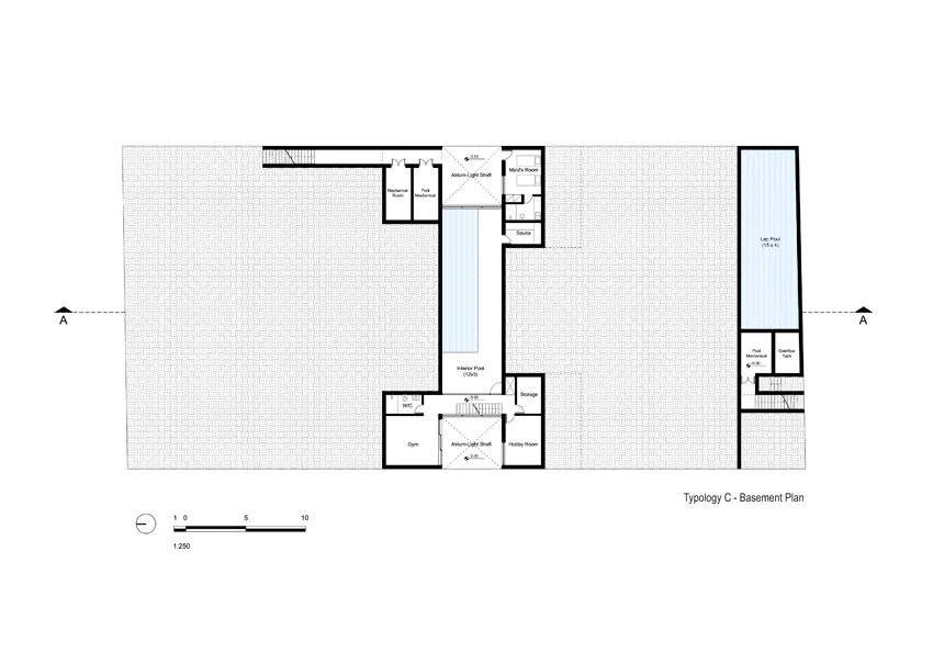 The ‘Porous Mosaic’ is a Cartesian pattern created by the staggering of indoor and outdoor spaces. The pattern is laid along the entire neighbourhood adapting to the topography, boundaries and roads. The interplay of built homes, vegetation and inhabited levels give the neighborhood a cohesive, articulated and dynamic character. Most of the built program is pushed to the egdes of the parcel, leaving the center space open. A sequence of large common spaces, privileged by privacy and views, inhabit the center of each lot. The pools stagger from front to back in adjoining properties.
