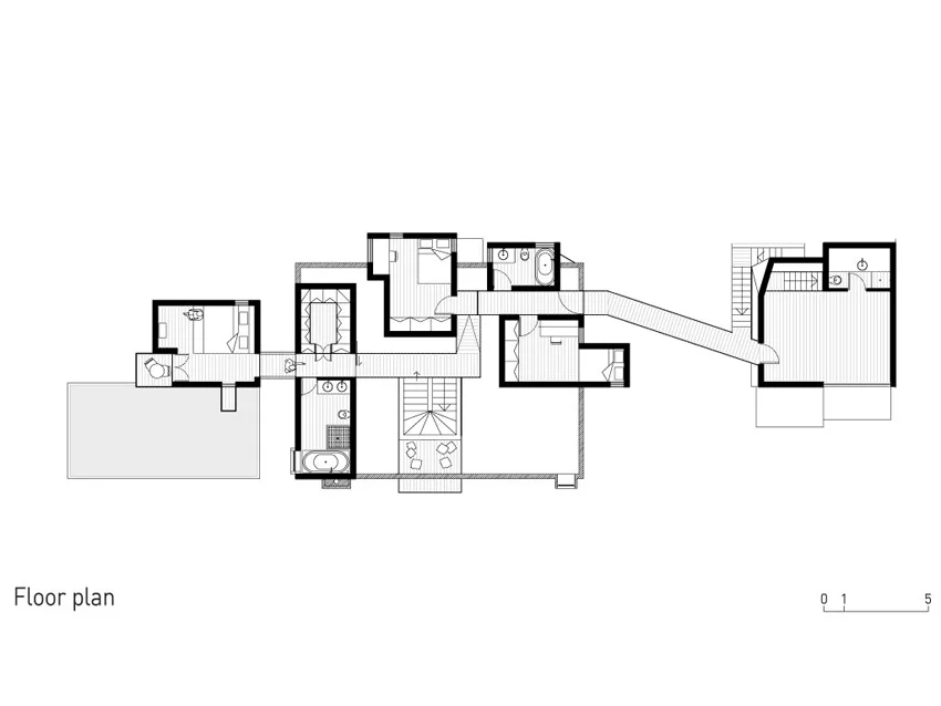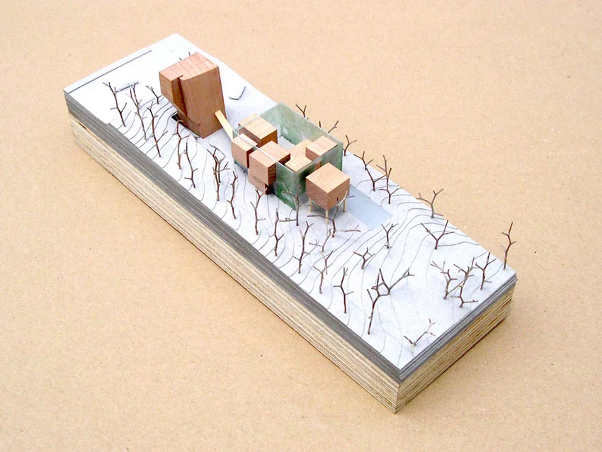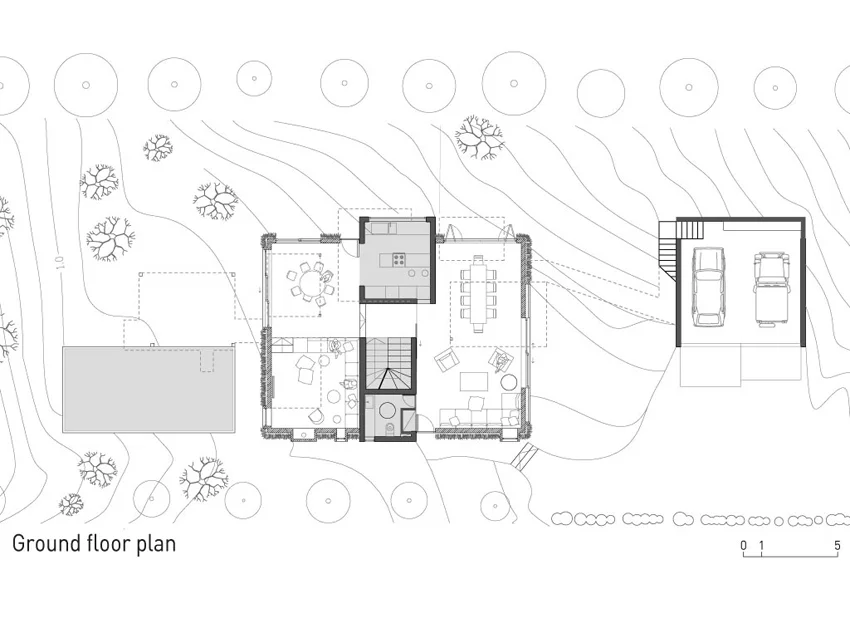 The clear linearity of the site points to an inevitable sequential organization of the program along the given buildable strip. However, preceding any formal or stylistic reflexes, it gives an opportunity to understand and present the home as a place of “choreographed” lived spaces and events. The choreography is drawn on both a planar and a sectional scale that represent the site, icons represent public/private individual/collective activities. These icons are ordered along the scale to generate and suggest possible sequences and cycles of