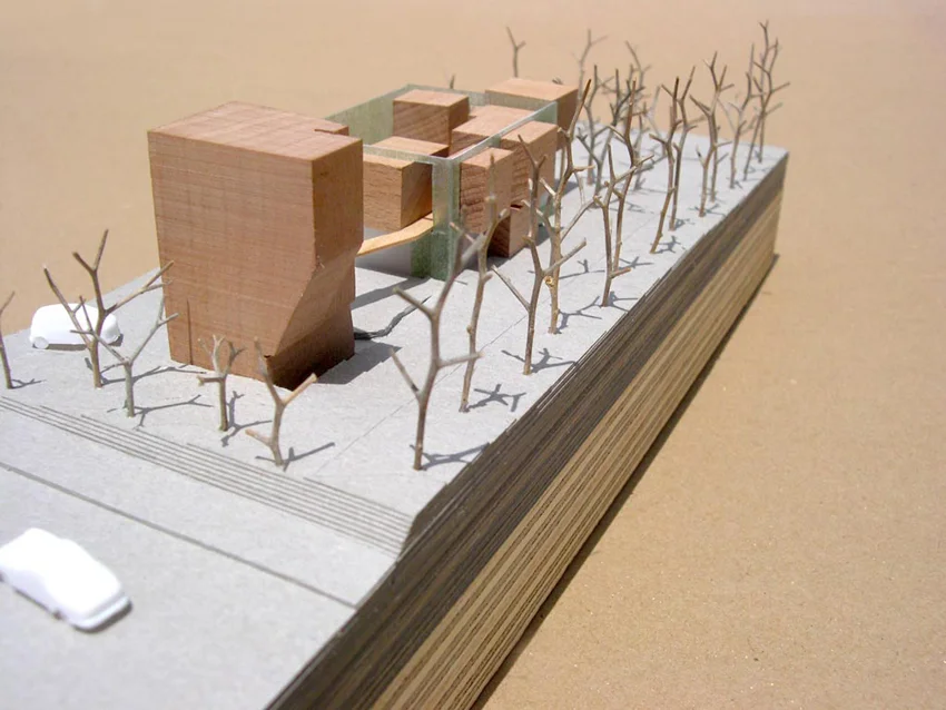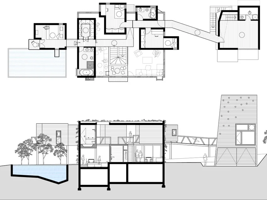 The incorporation of "familiar & fantastic" came from an understanding of the youthfully playful character of the clients, a dancer and a photographer. The home is understood as a place of “choreographed” lived spaces and events. The choreography is drawn on both a plan and a section, icons represent public/private individual/collective activities. These icons are ordered along the scale to generate and suggest possible sequences and cycles of everyday life. Included are icons of basic and standard needs but also included are icons that reflect a playful attitude to life. This exploration points to ways of relating a full collection of activities and results in a place which will weave playfulness and fantasy together with the familiar activities and routines of every-day family life.
